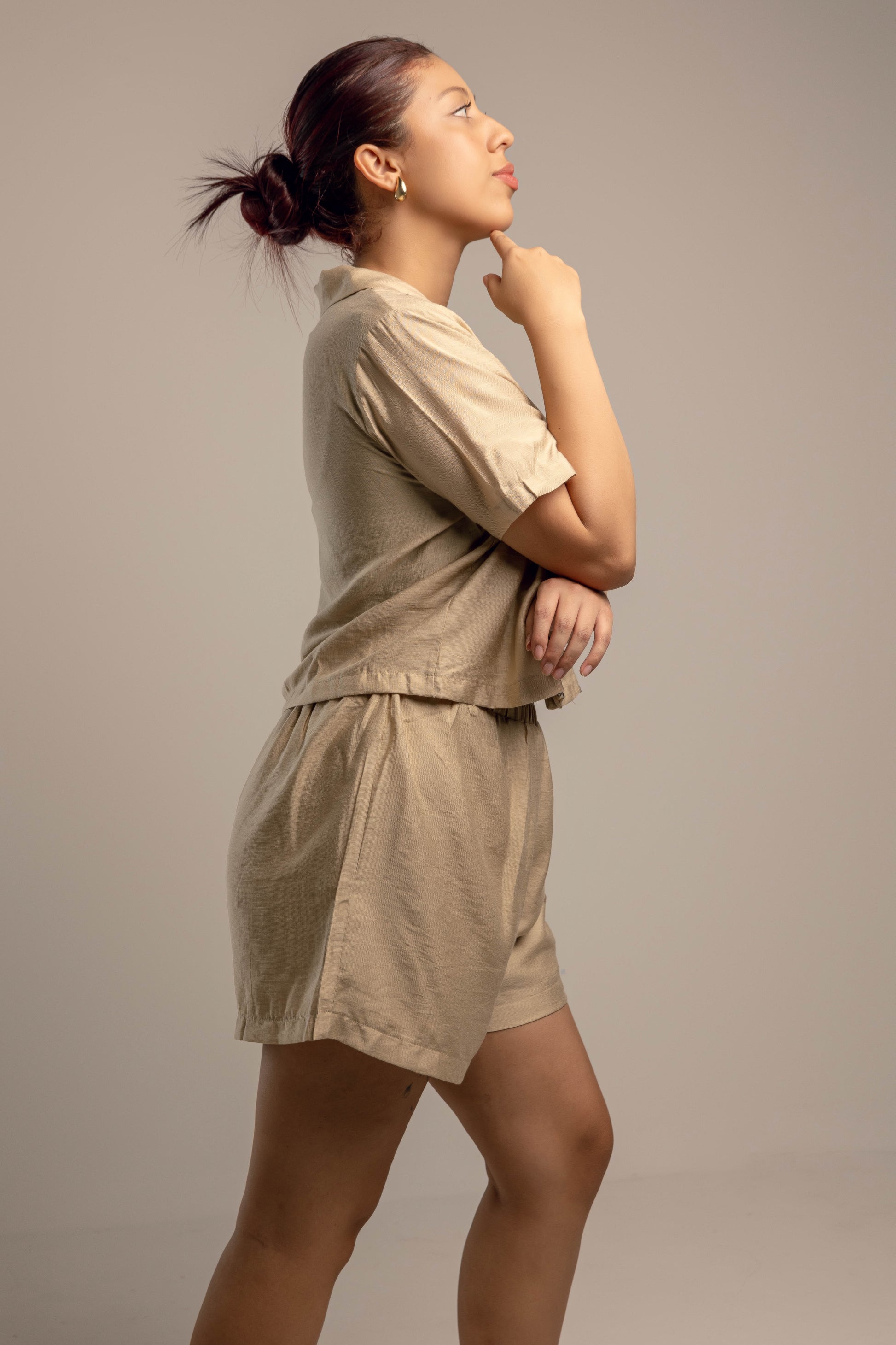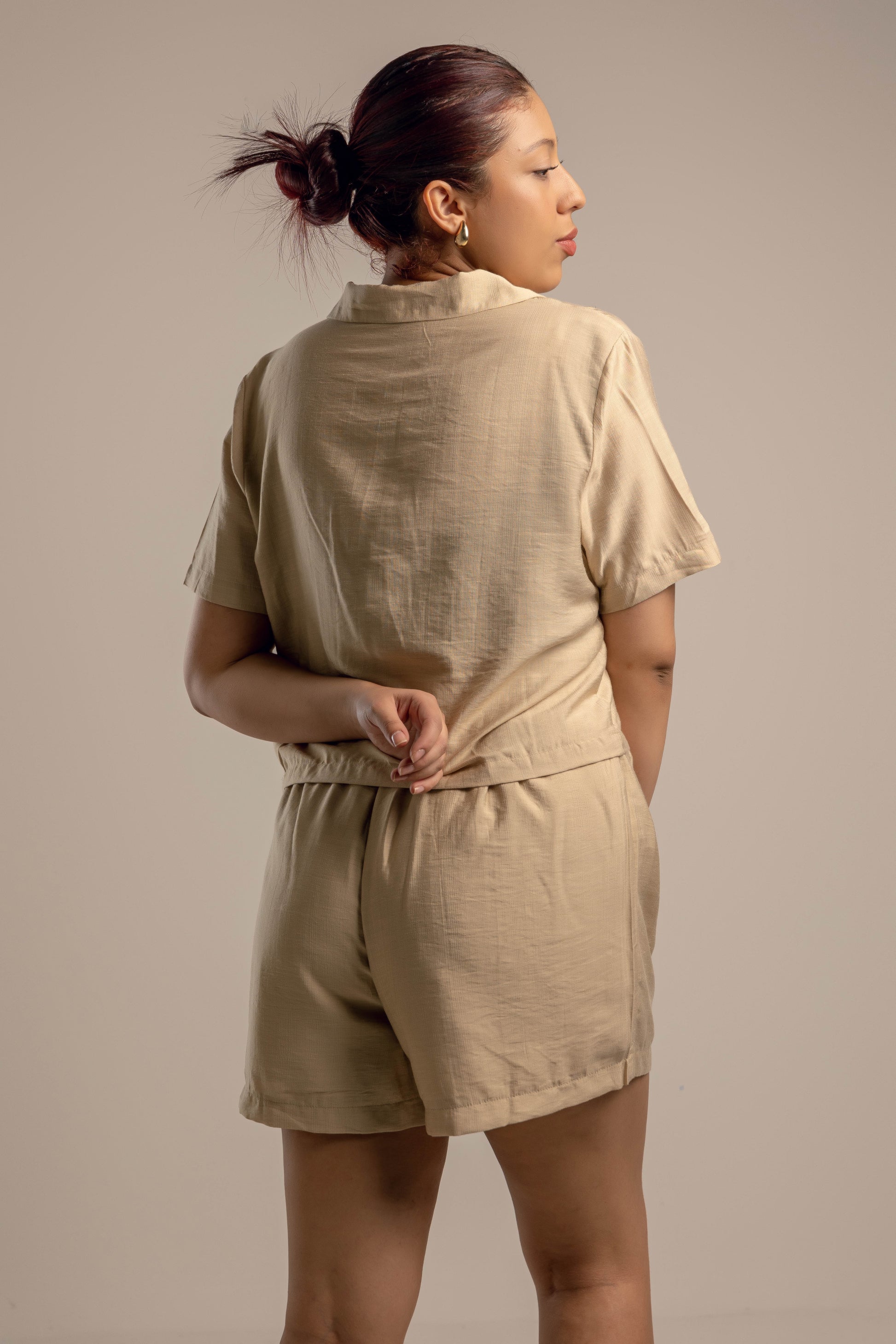 Este conjunto de dos piezas en tono beige es la definición de frescura y estilo relajado. La camisa de manga corta con cuello clásico y botonadura frontal destaca por su delicado bordado negro, aportando un toque artesanal y sofisticado. El short de tiro alto y cintura elástica garantiza comodidad y libertad de movimiento, ideal para días soleados, paseos o reuniones informales. El tejido de lino proporciona suavidad y transpirabilidad, convirtiendo este set en una opción versátil y atemporal para tu guardarropa.