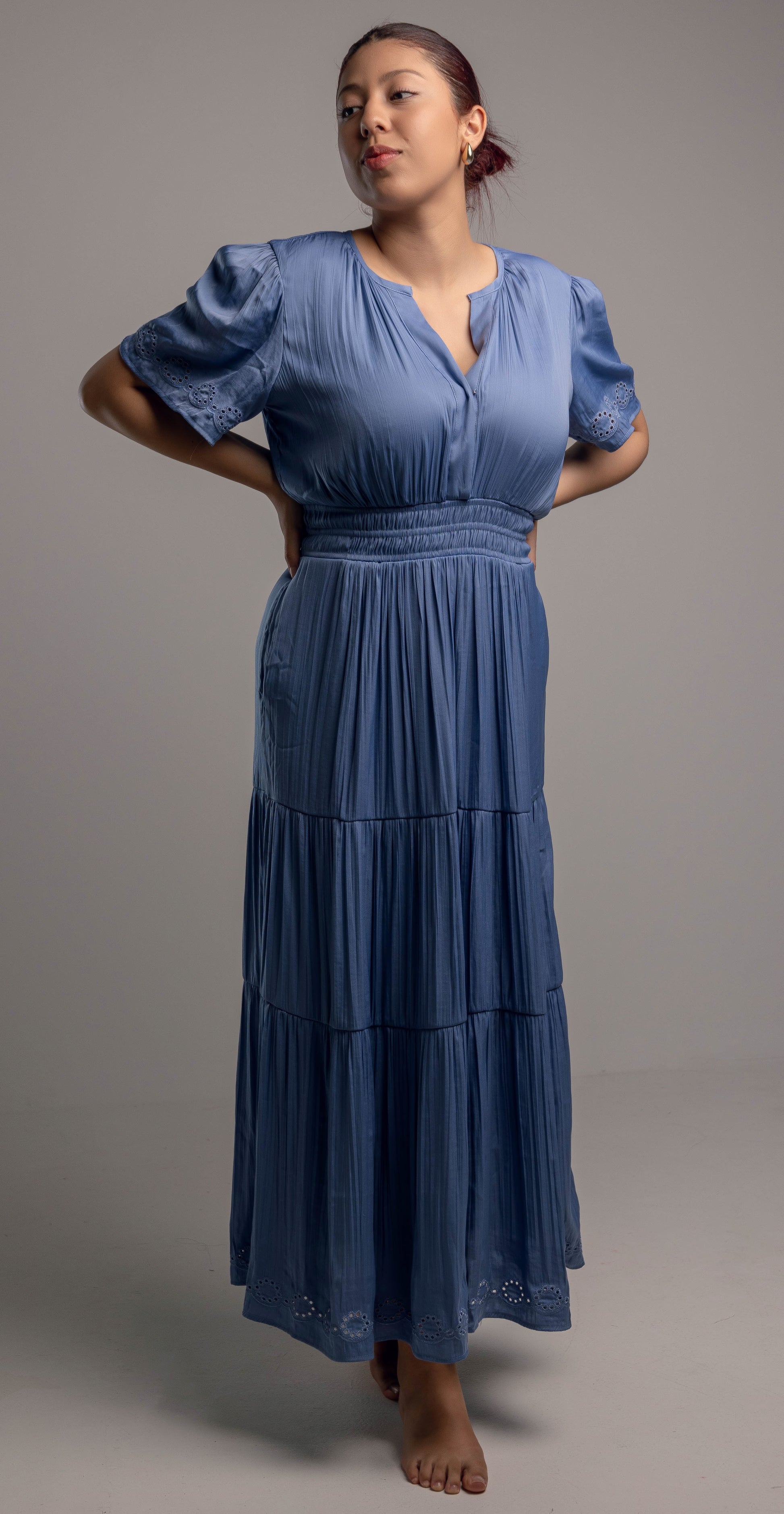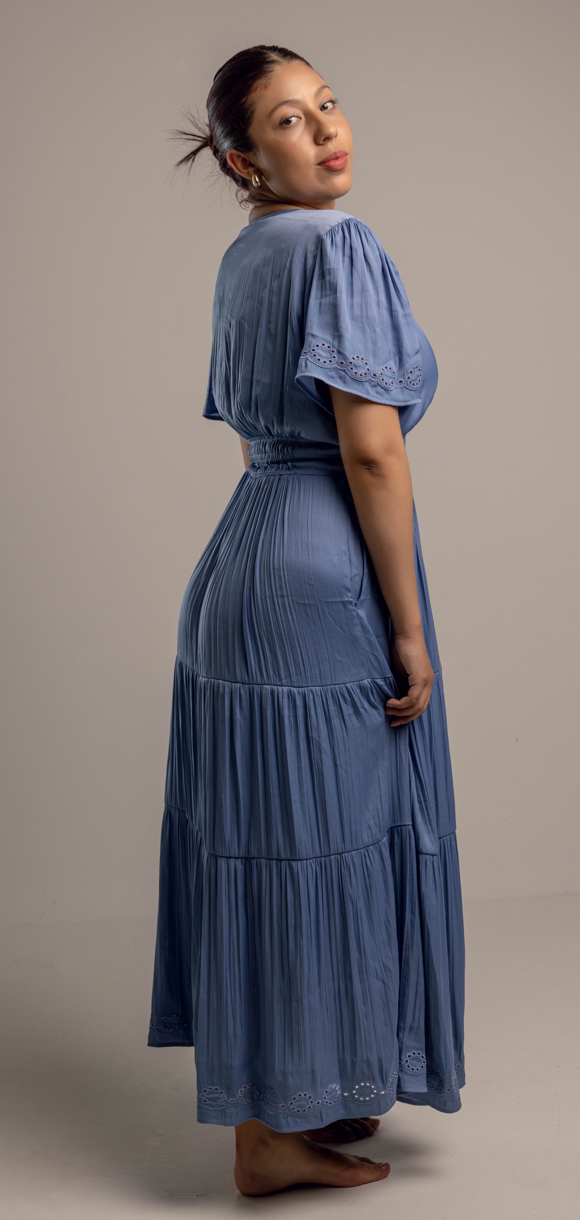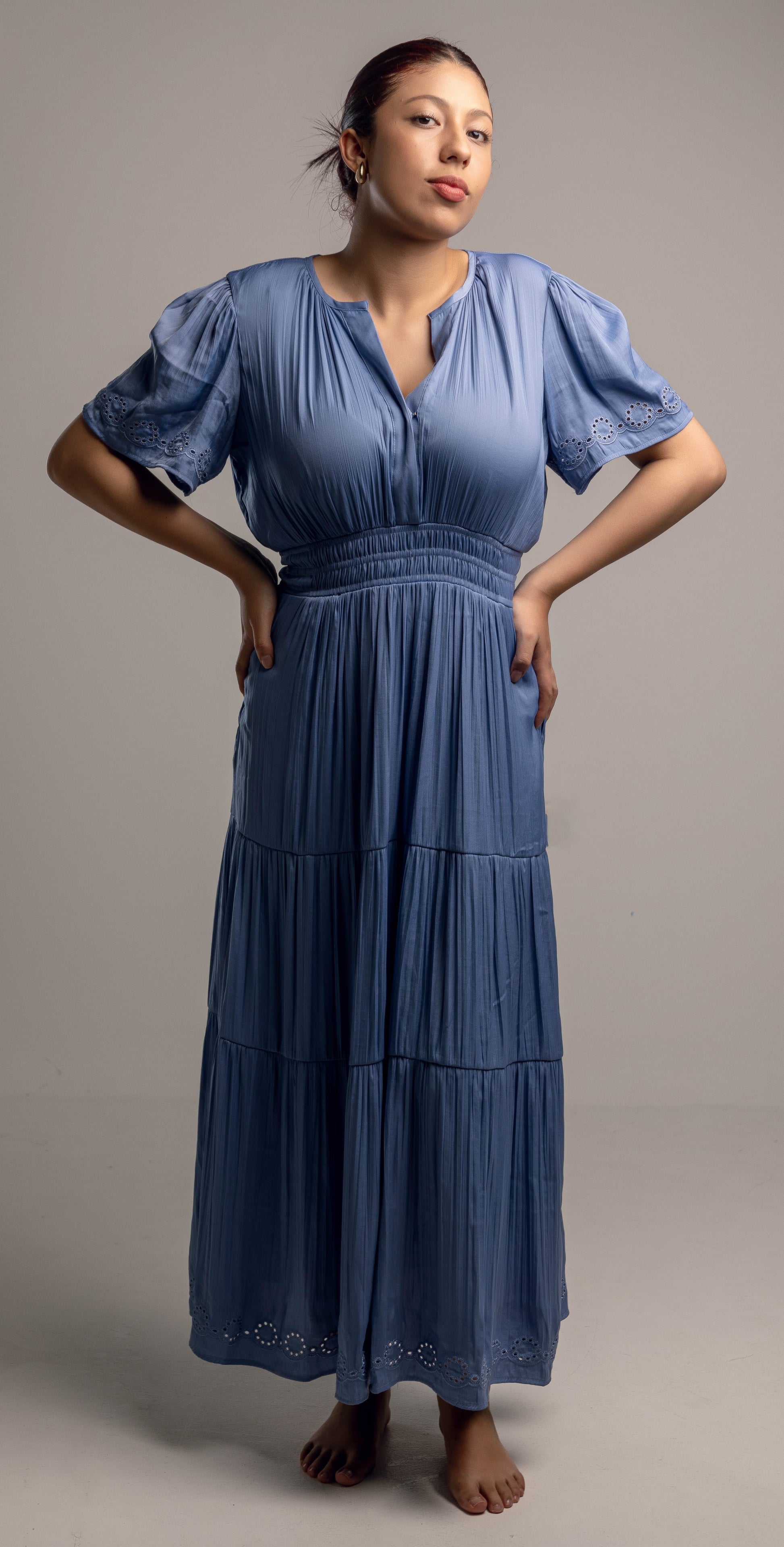 Este vestido largo azul es la elección perfecta para quienes buscan comodidad y elegancia en una sola prenda. Su diseño de manga corta abullonada, escote en V con detalle de amarre y cintura marcada realza la figura y aporta un aire romántico y bohemio. La falda amplia con cortes en niveles y los delicados bordados en el ruedo y las mangas añaden un toque artesanal y femenino, ideal para eventos de día, paseos o reuniones especiales.