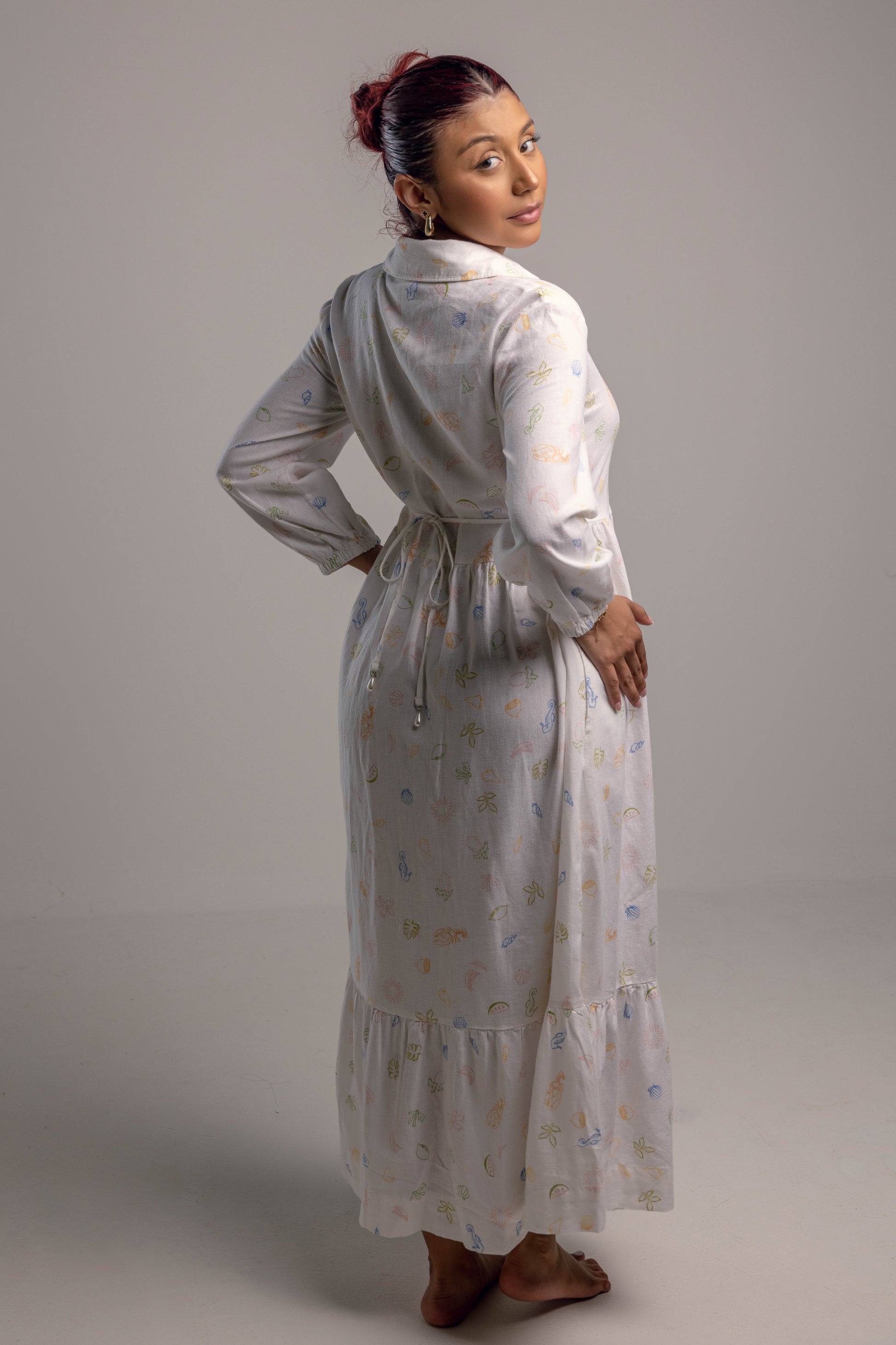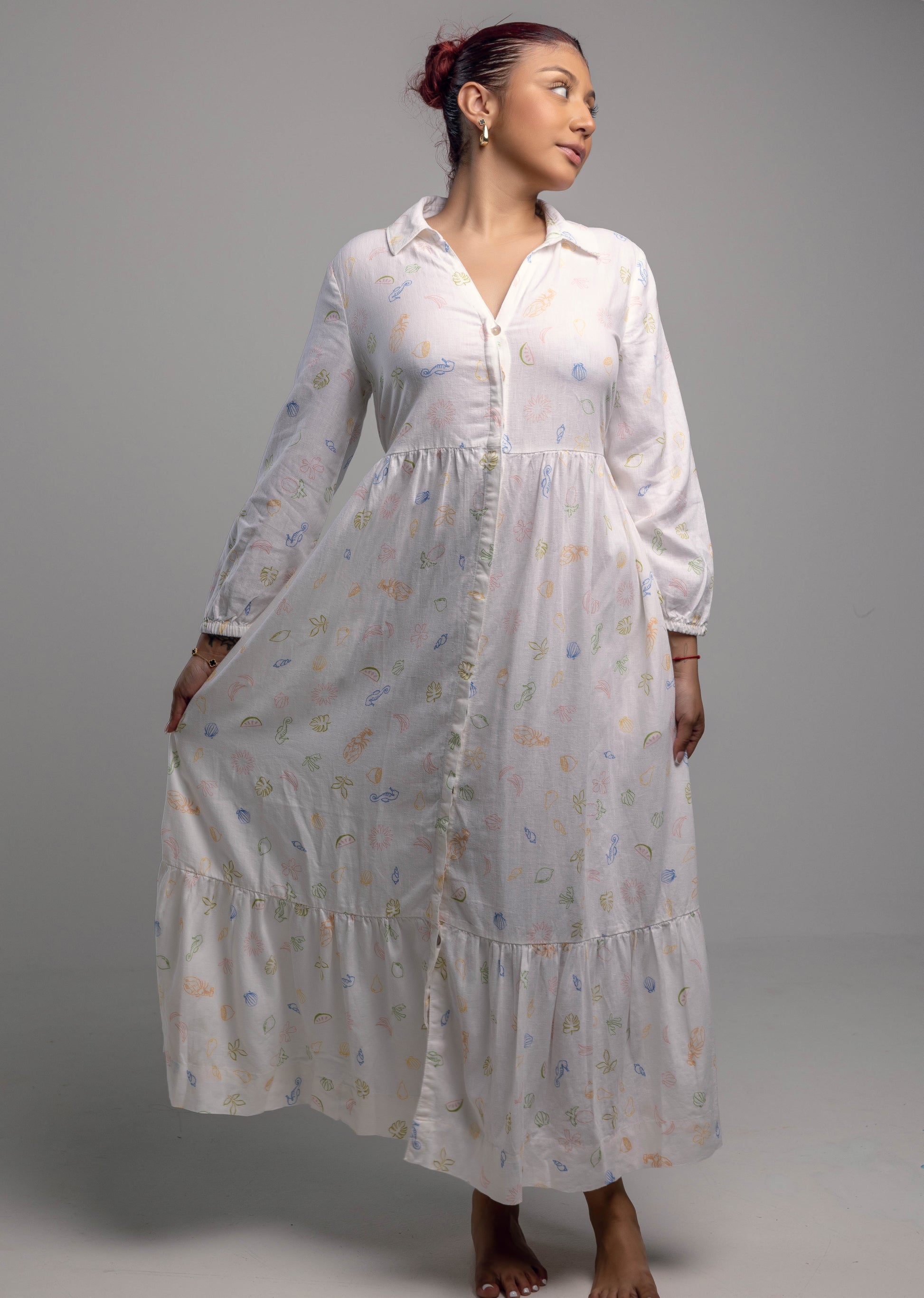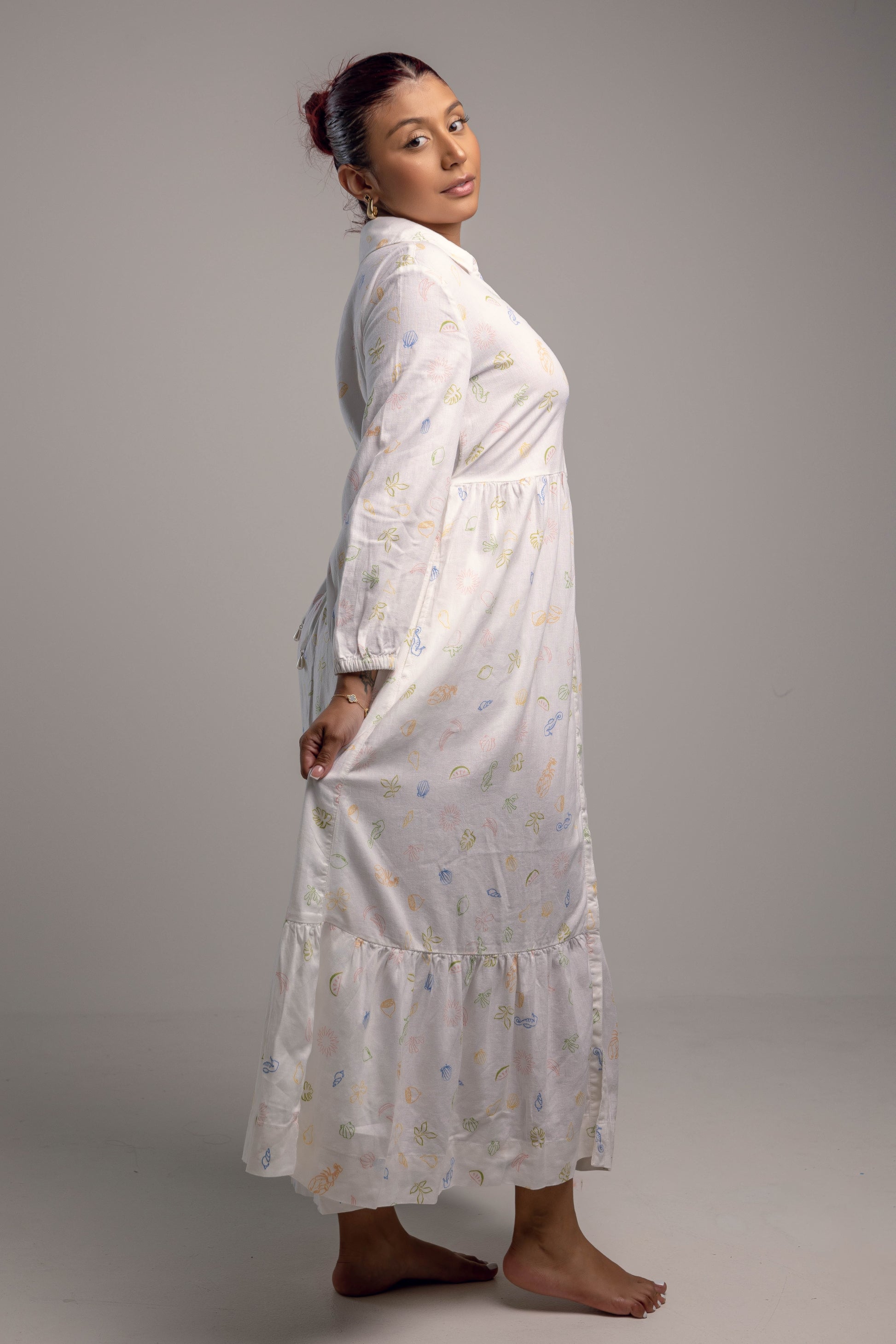 Este vestidolargo camisero encolor blancocon delicado estampado floral esla opción perfectapara quienesbuscan elegancia ycomodidad enuna sola prenda. Susilueta ampliay fluida, juntocon las mangaslargas y el cuelloclásico, aportan un aire romántico y atemporal. Labotonadura frontaly la falda decaída suave loconvierten enuna pieza versátil, ideal paraeventos de día, paseos al airelibre o reunionesespeciales. Combínalo con sandalias o cuñas paraun look frescoy sofisticado.