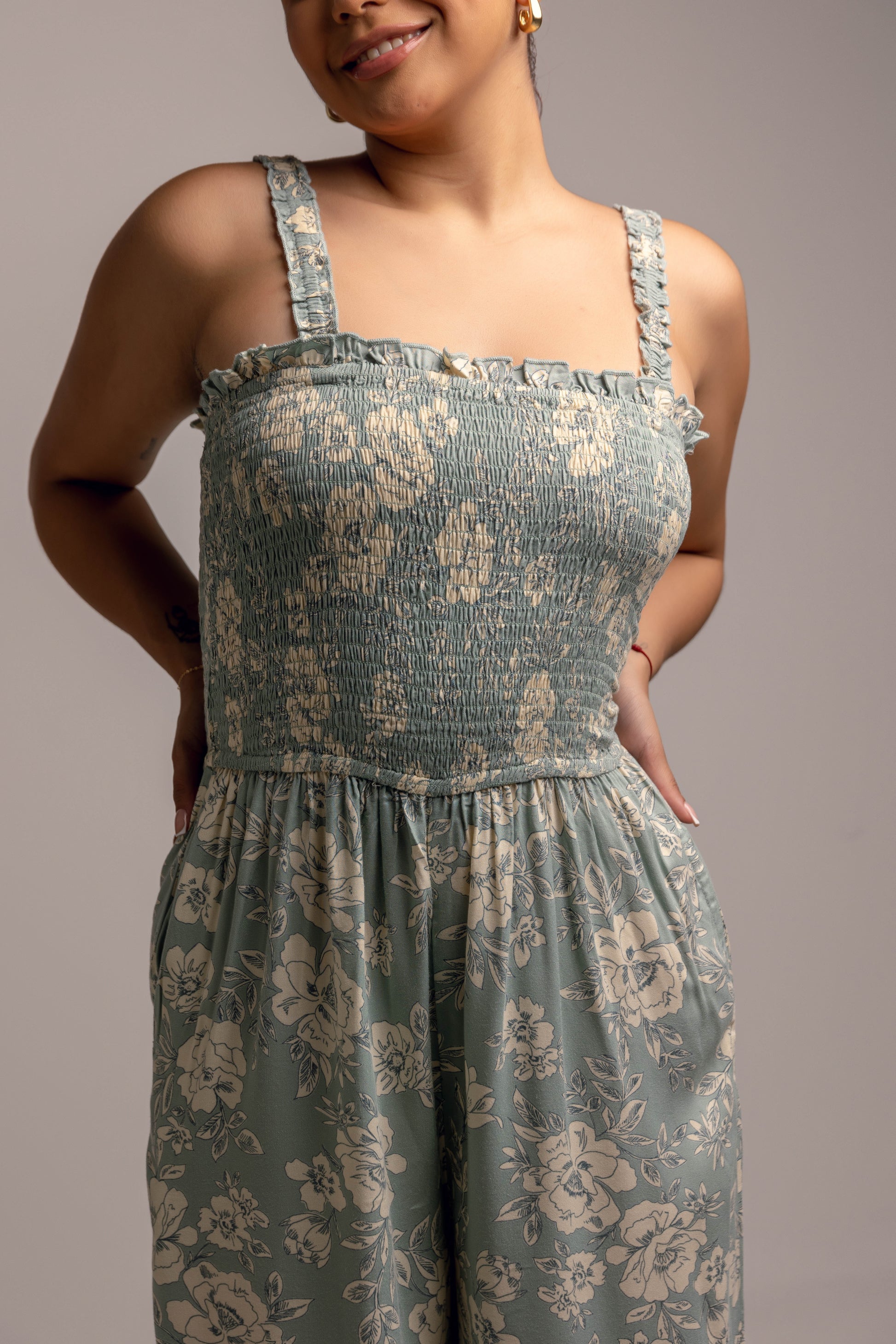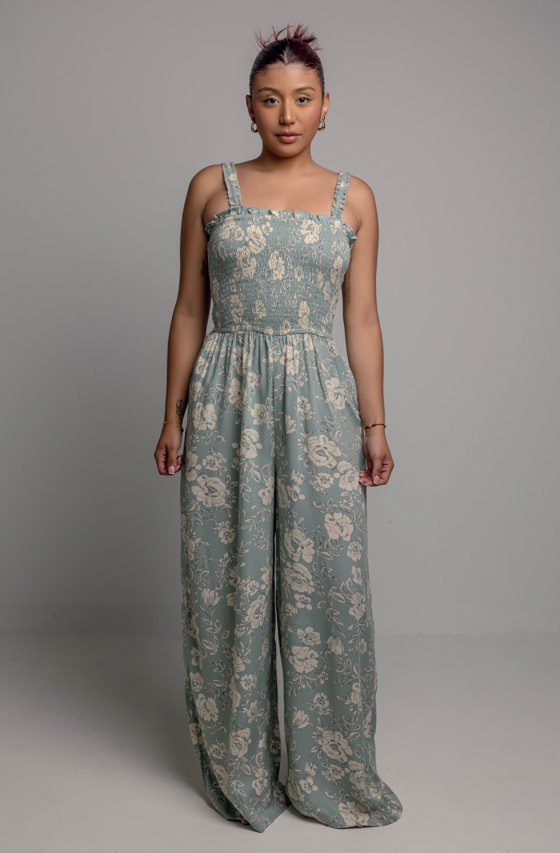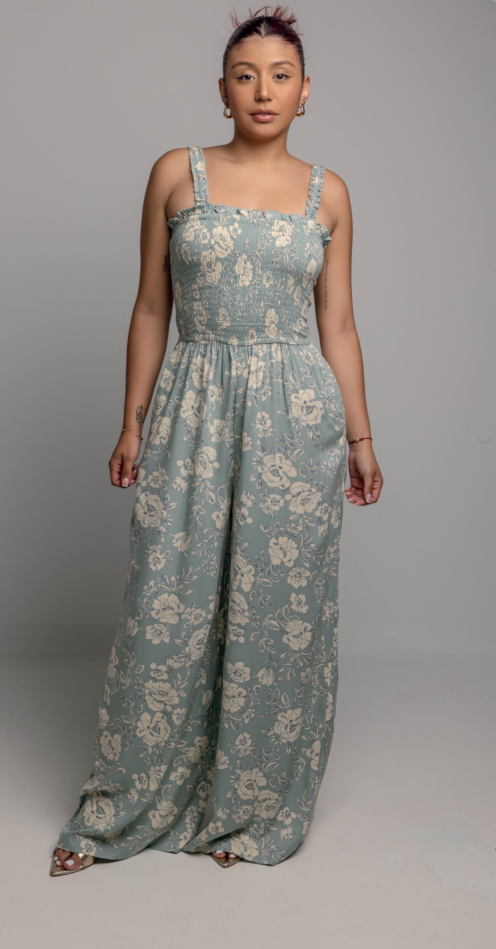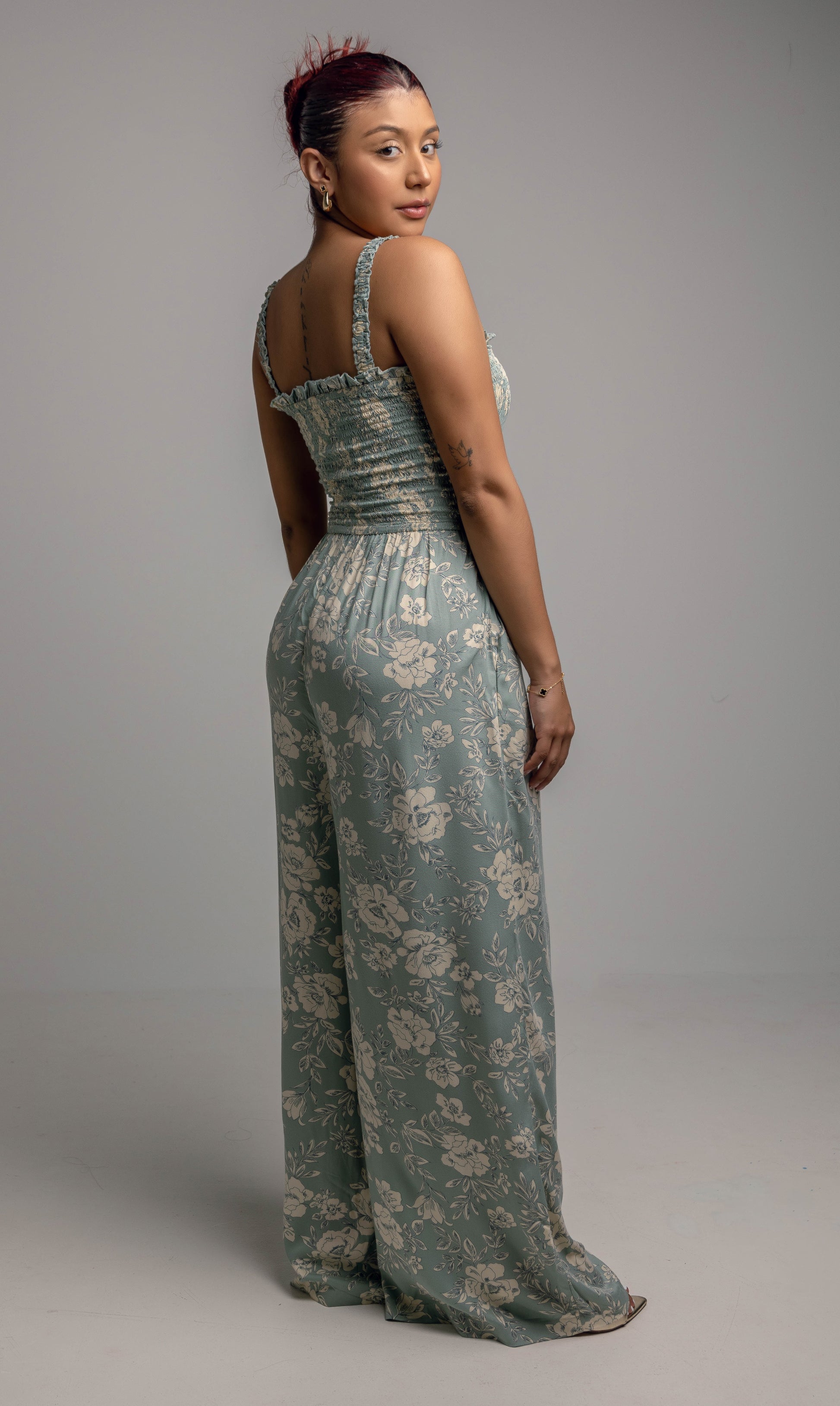 Este jumpsuit de tirantes entonos verde ybeige con estampado floral esla prenda perfectapara quienesbuscan comodidady estilo en unasola pieza. Sucuerpo fruncido ytirantes anchos realzan la figura, mientras quela pierna ancha y el tejidoligero garantizan frescura ylibertad de movimiento. Ideal para díassoleados, paseos al aire libreo reuniones informales, este enterizo combina unaire romántico ybohemio con lapracticidad deuna silueta modernay relajada.
