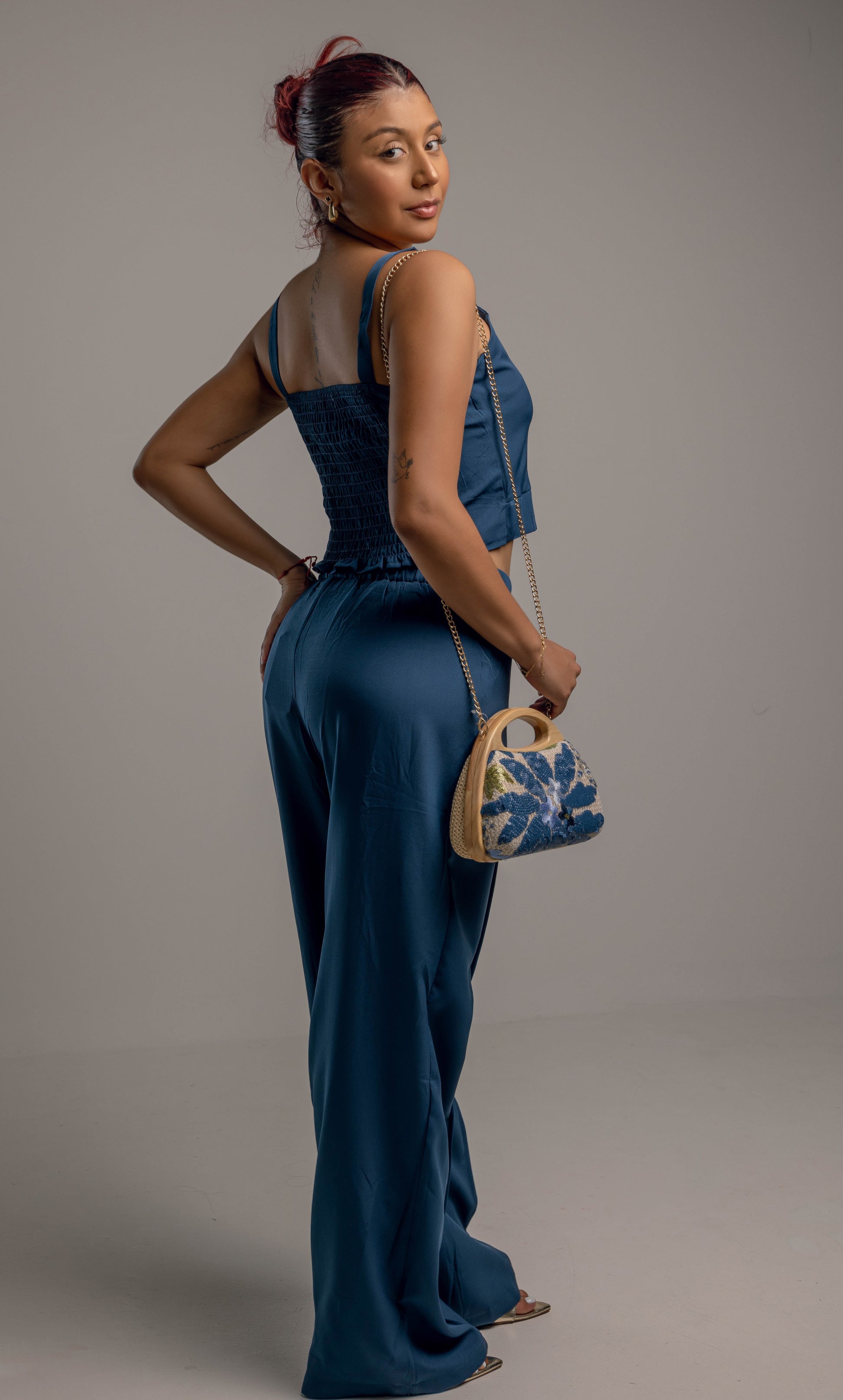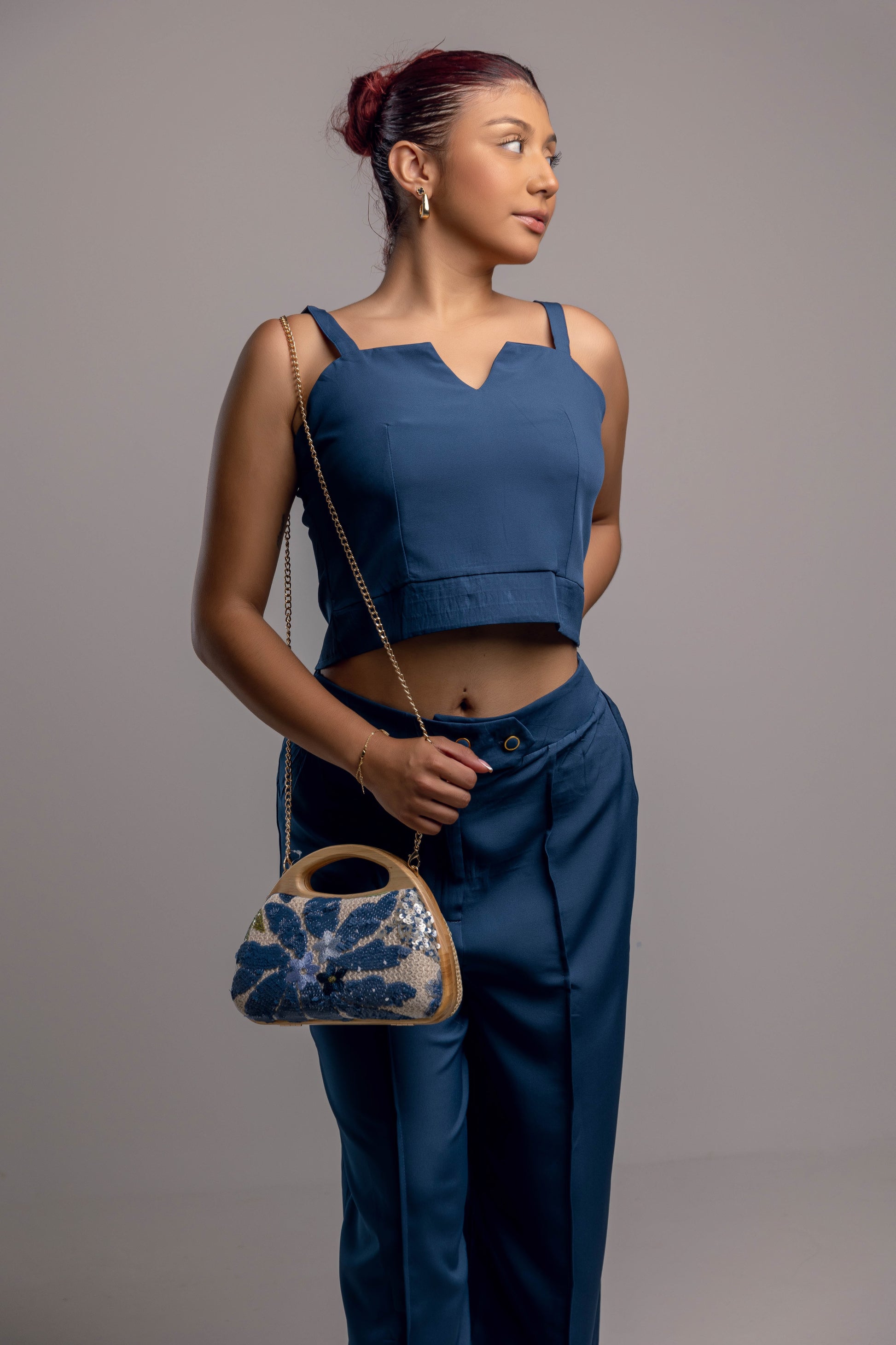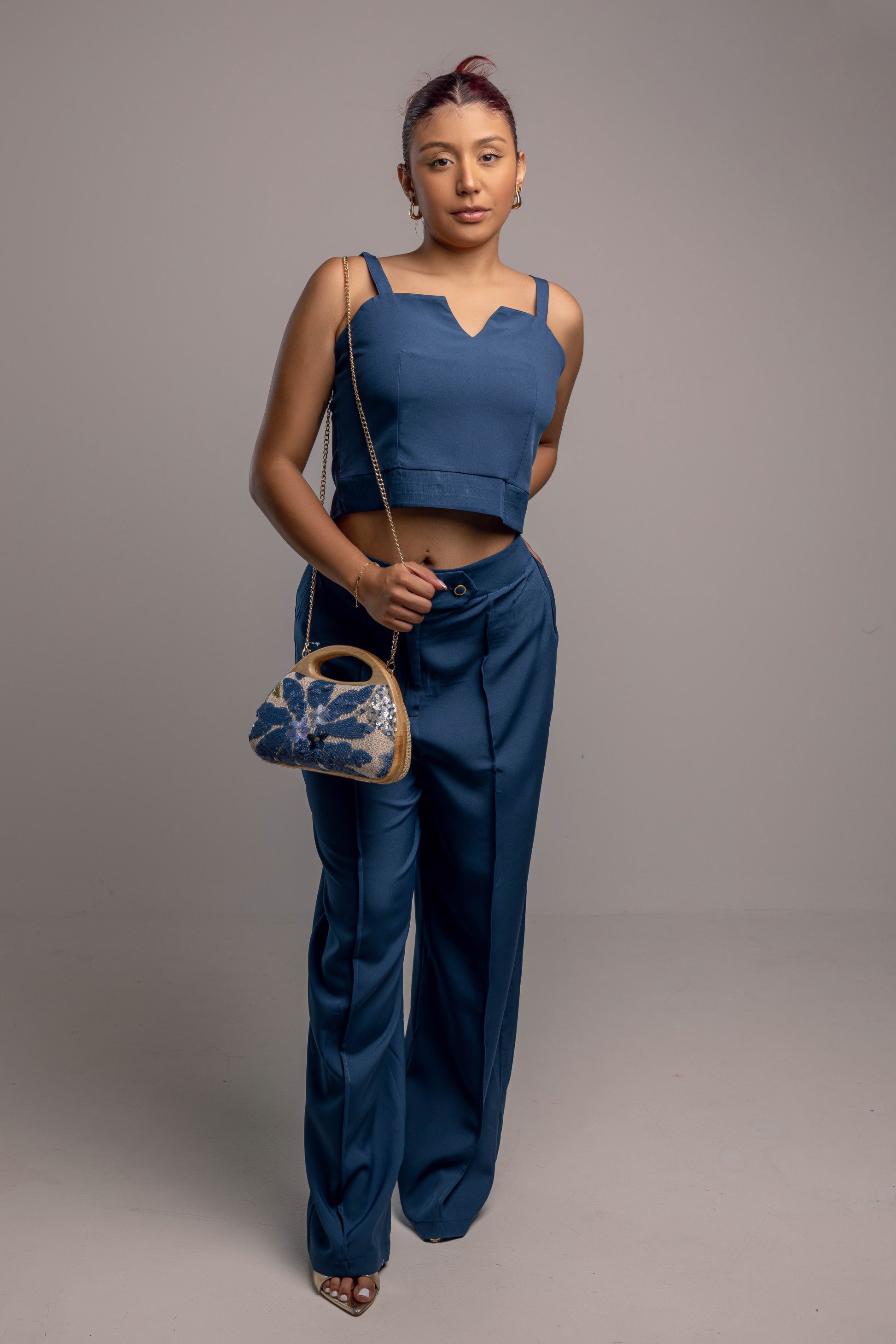 Este conjunto de top y pantalón en mezclilla azul es la opción perfecta para quienes buscan un look moderno, versátil y sofisticado. El top corto de tirantes anchos destaca por su escote geométrico y acabado estructurado, realzando la figura con un toque contemporáneo. El pantalón de tiro alto y corte recto estiliza y aporta comodidad, siendo ideal tanto para ocasiones casuales como para salidas más elegantes. Completa el look con un bolso artesanal para un estilo urbano y chic que no pasa desapercibido.