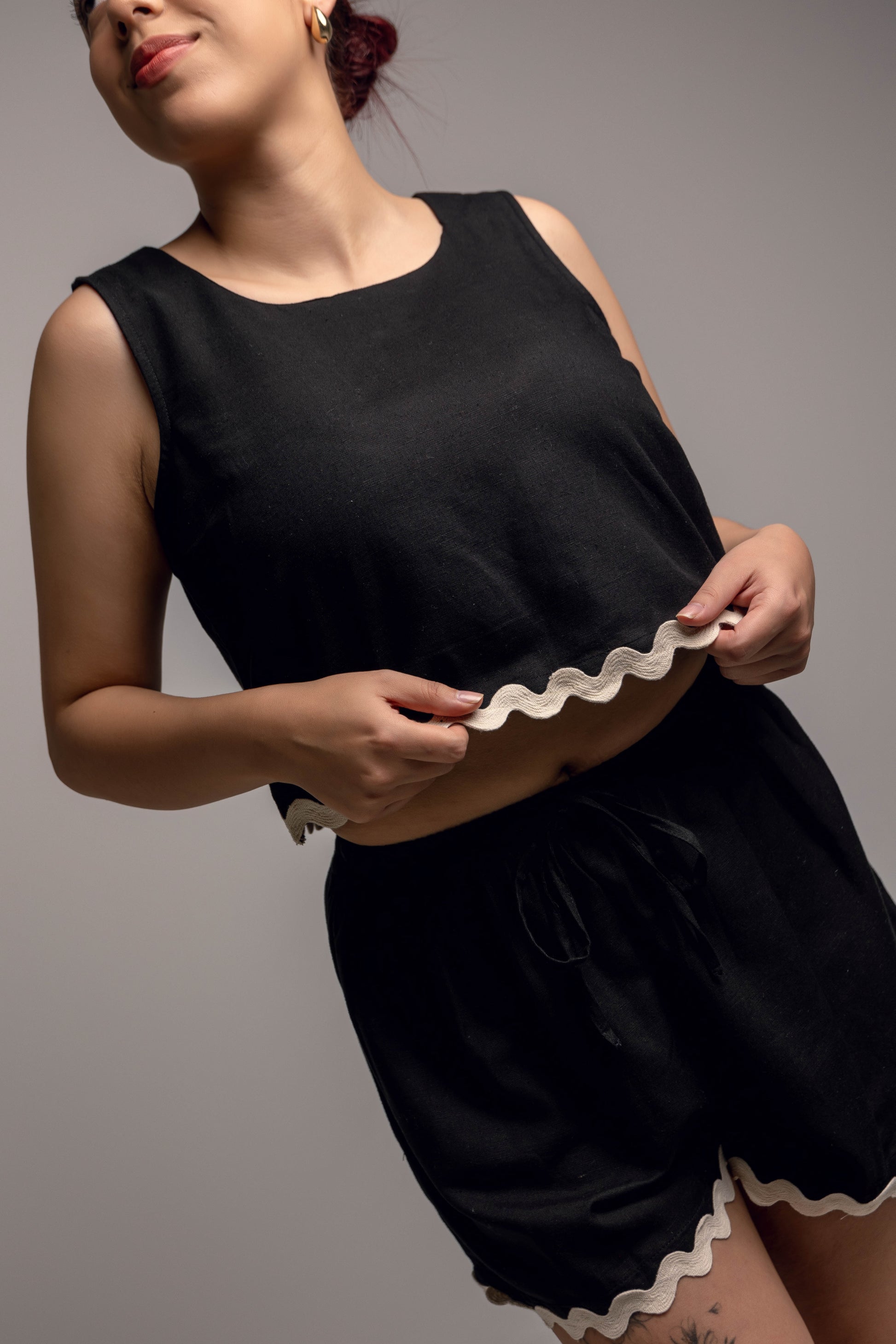 Este conjuntode dos piezasen color negroes la mezclaperfecta de comodidady estilo femenino. El top sin mangasde corte recto y el short detiro alto presentanun delicado ribete de encaje blancoen los bordes, aportando un contrasteelegante y untoque romántico. Confeccionado entejido ligeroy suave, es idealpara días dedescanso, paraestar en casao para lucir unlook relajado ychic en climas cálidos