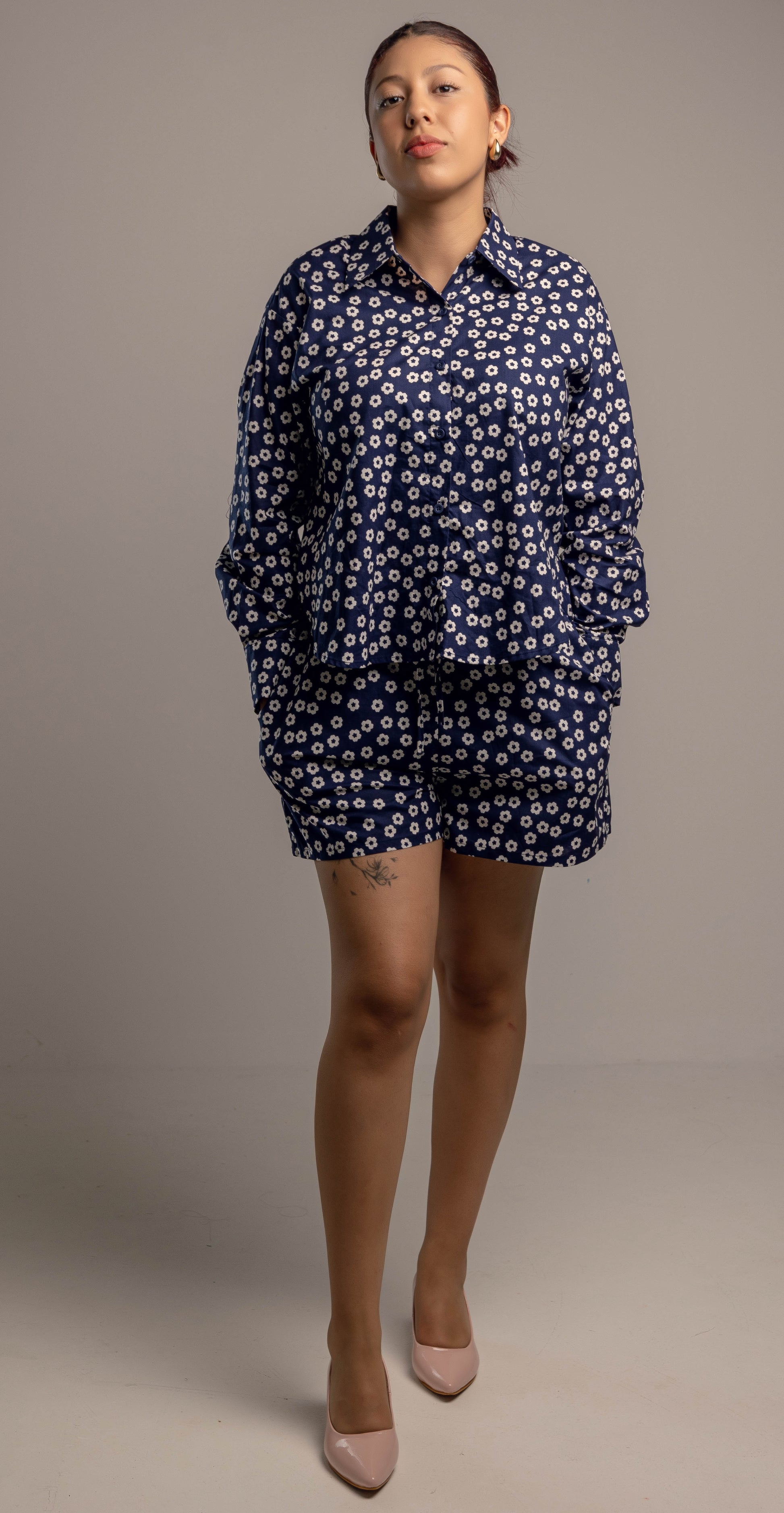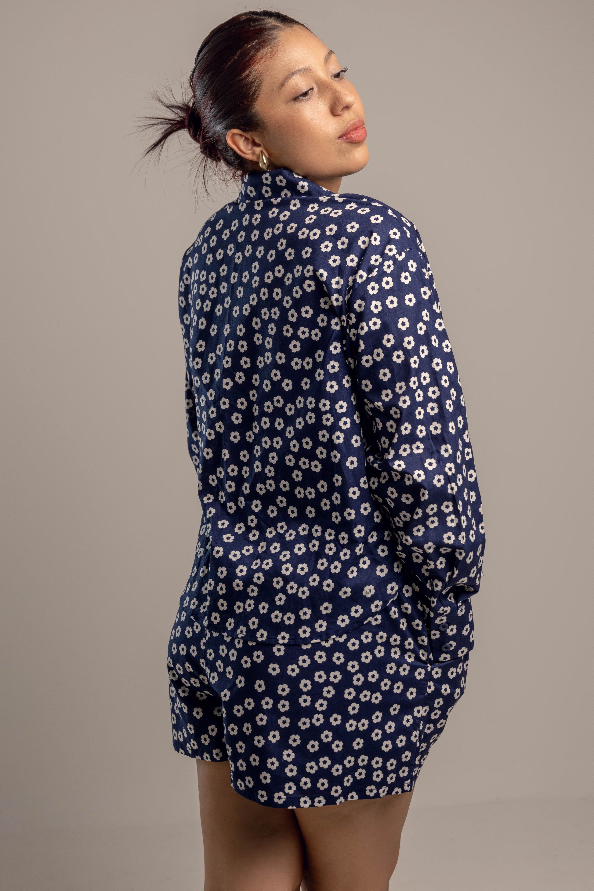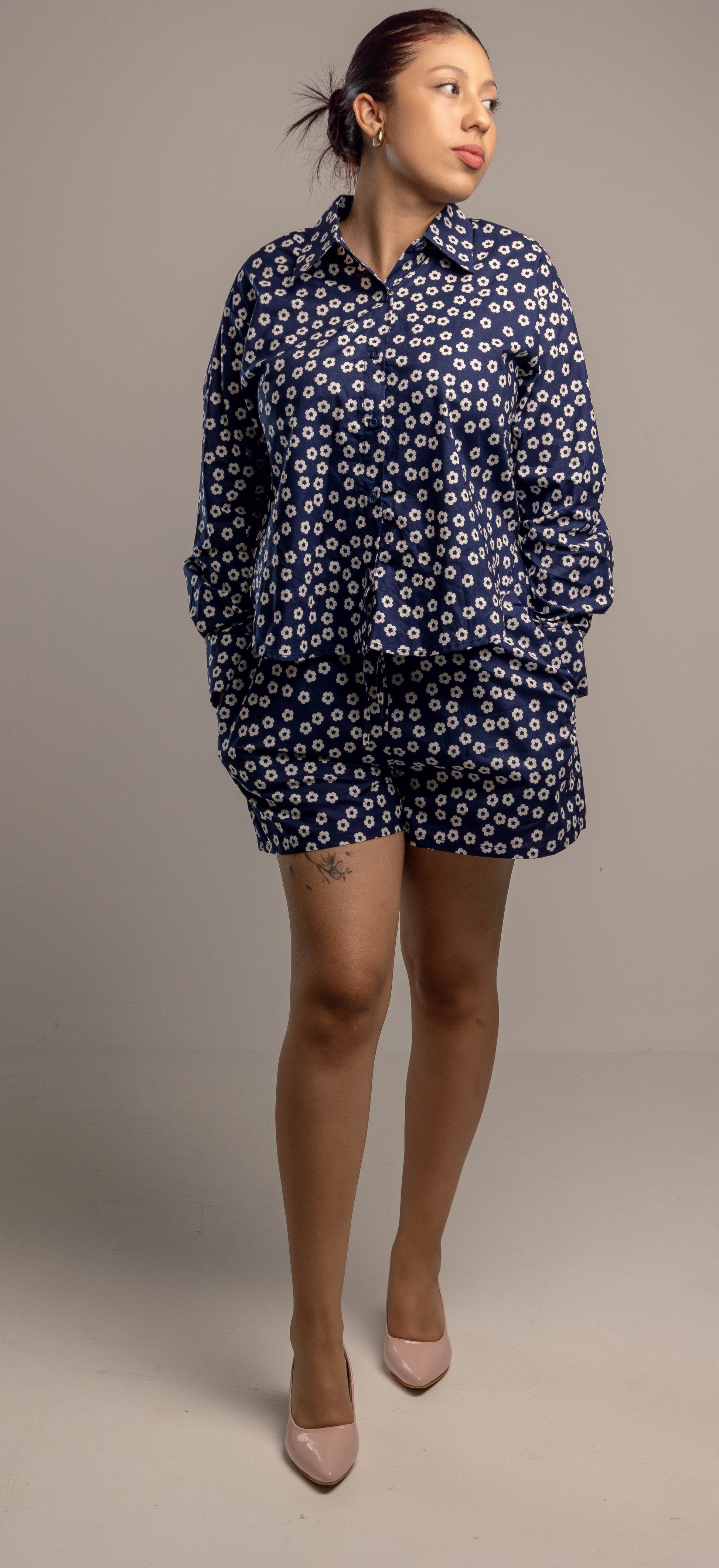 Este conjunto de dos piezas en azul marino con estampado floral blanco es la opción perfecta para quienes buscan comodidad y estilo en una sola prenda. La camisa de manga larga y cuello clásico aporta un aire relajado y moderno, mientras que el short de tiro alto y corte suelto garantiza frescura y libertad de movimiento. El estampado floral aporta un toque femenino y atemporal, ideal para días cálidos, paseos al aire libre o reuniones informales. Puedes llevar las piezas juntas para un look coordinado o combinarlas por separado para multiplicar tus opciones de estilo.