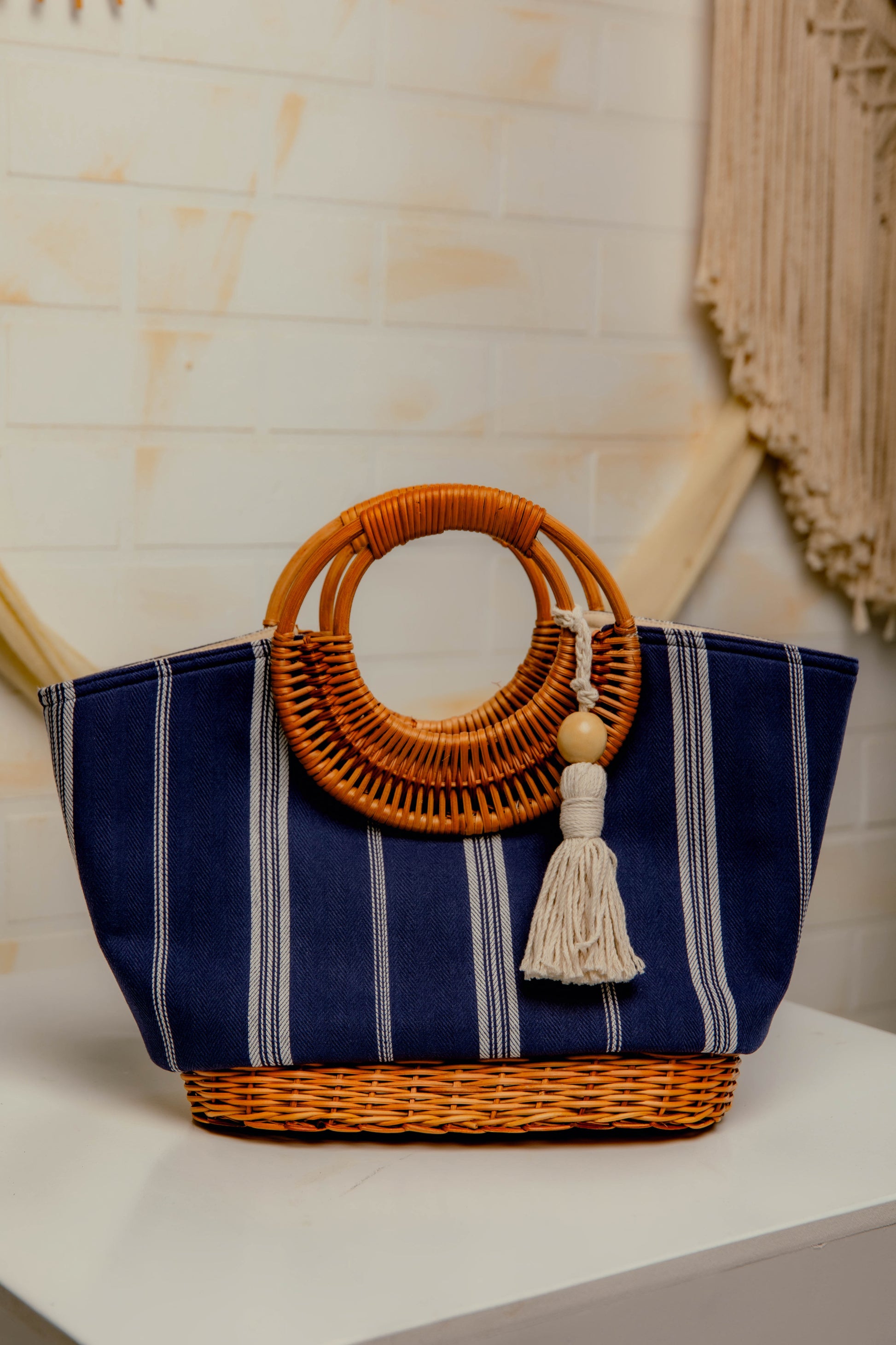 Este bolso artesanal fusiona lo clásico y lo moderno con su diseño de rayas azul marino y blanco, complementado por una base tejida y asas circulares en fibras naturales. El detalle de borla con cuentas de madera aporta un toque bohemio y elegante, haciendo de este accesorio la elección perfecta para días de verano, paseos al aire libre o escapadas de fin de semana. Su estructura espaciosa y resistente lo convierte en un aliado práctico y estiloso para cualquier ocasión.