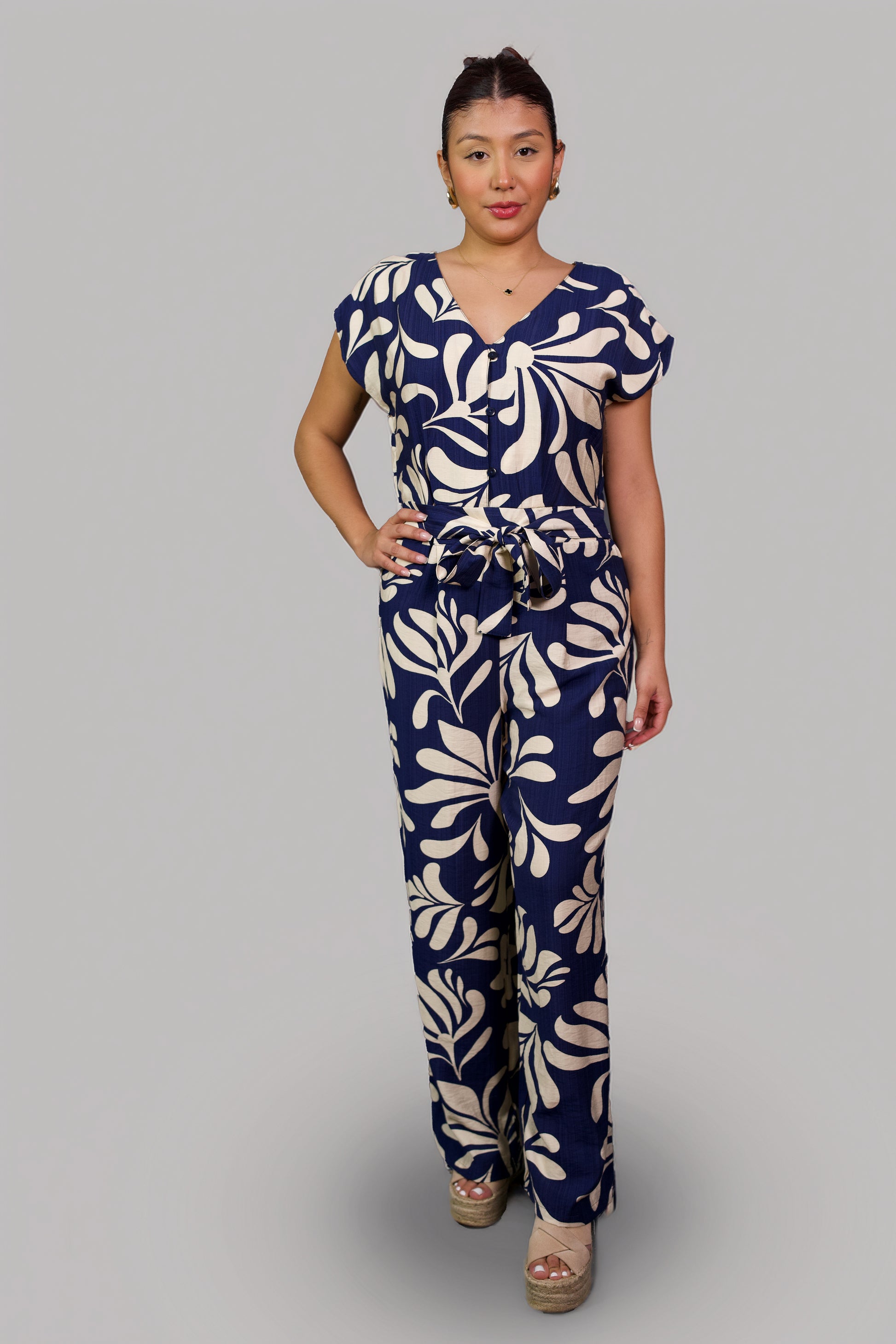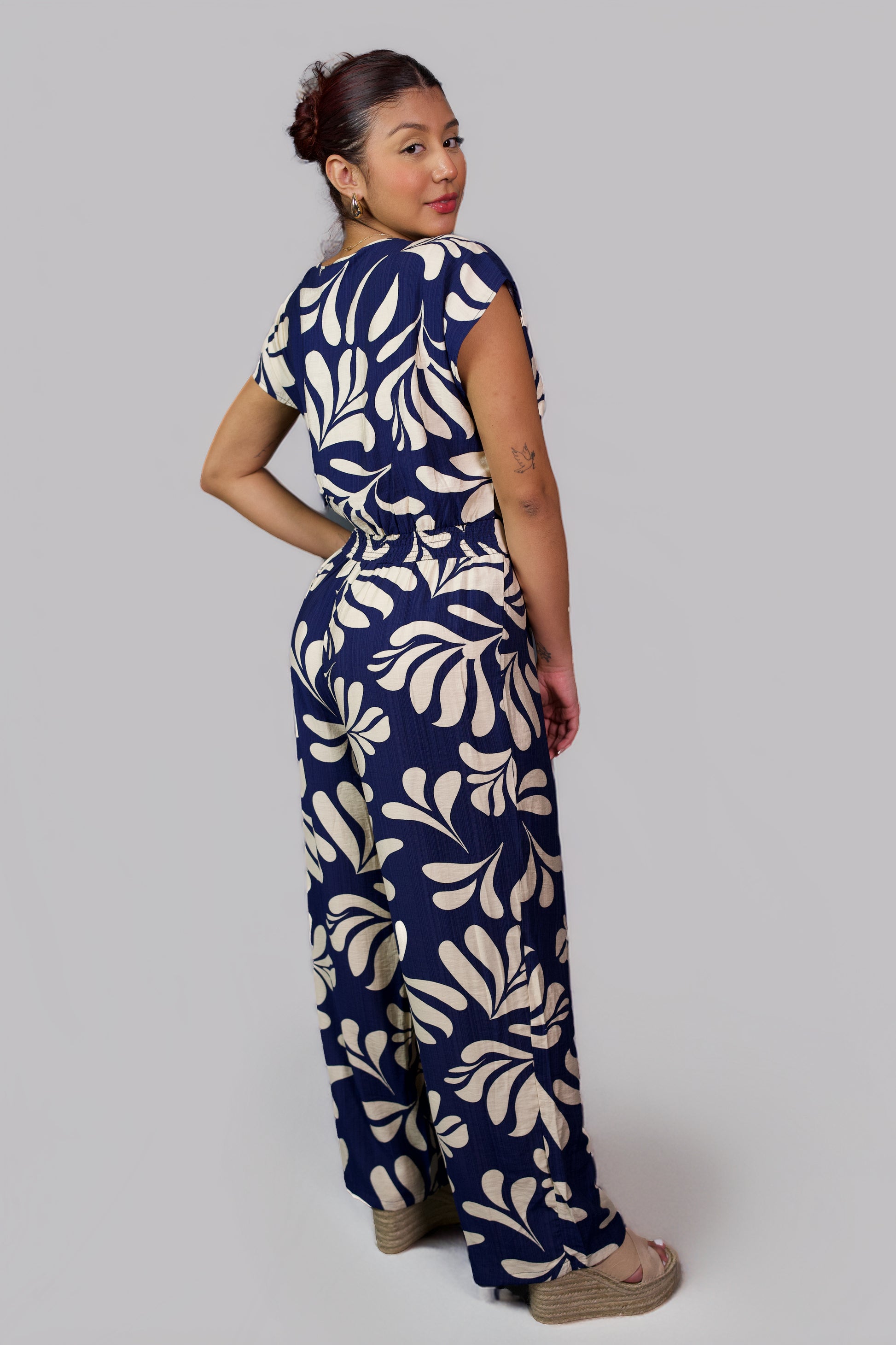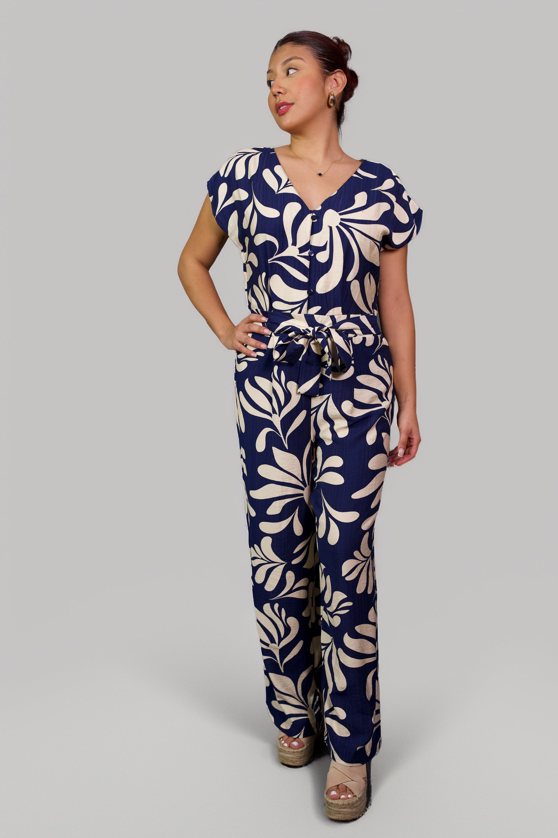 Atrévete a destacar con este jumpsuit de fondo azul marino y estampado de hojas en beige, una prenda que combina comodidad y estilo en una sola pieza. Su silueta fluida y el cinturón ajustable realzan la figura, mientras que el escote en V y las mangas cortas aportan un aire fresco y moderno. El tejido ligero y transpirable lo convierte en la opción perfecta para días cálidos, reuniones informales o eventos donde quieras lucir sofisticada sin renunciar al confort. Un diseño versátil que te acompañará tanto de día como de noche.