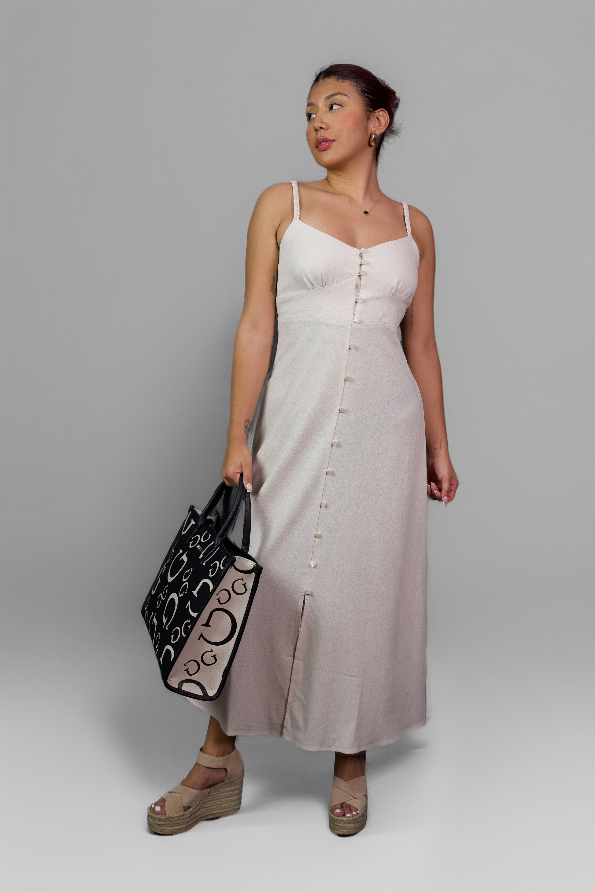 Este vestidolargo en colorblanco es ladefinición deelegancia y frescura. Su diseñode tirantes finos y escote enV realza loshombros y elcuello, mientrasque la silueta ligeramenteentallada y laabertura frontalaportan un toquemoderno y femenino. Confeccionado enun tejido ligeroy cómodo, esperfecto paradías soleados, eventoscasuales o unasalida especial. Combínalo consandalias o cuñas y accesoriosllamativos paraun look sofisticado y versátil quese adapta a cualquierocasión.