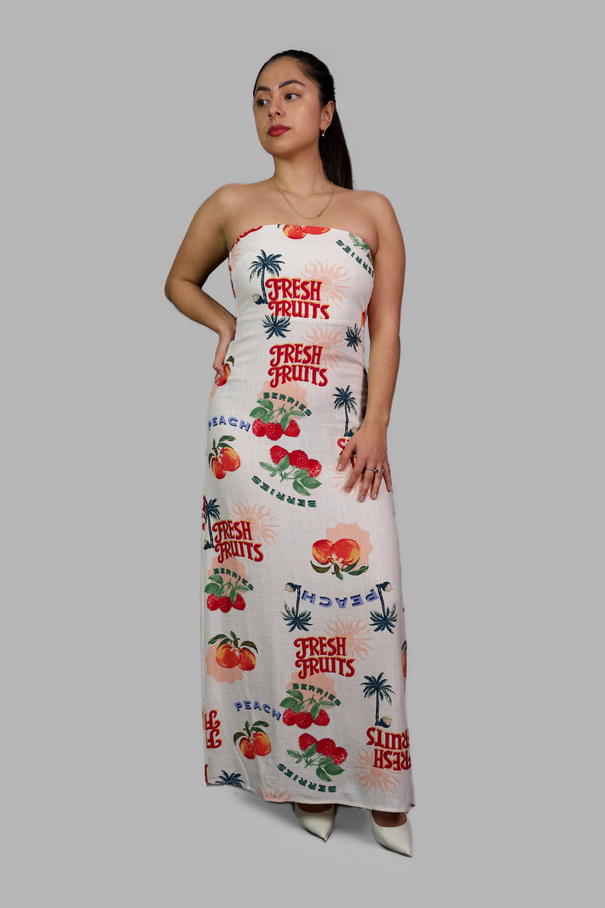 Refresca tu estilo con este vestido largo palabra de honor en color blanco, decorado con un alegre estampado de frutas y palmeras en tonos rojo, verde y azul. Su diseño sin tirantes realza los hombros y el escote, mientras que la silueta recta y el tejido ligero garantizan comodidad y libertad de movimiento. Es la prenda perfecta para destacar en días soleados, vacaciones o eventos casuales, aportando un toque divertido y original a tu look.