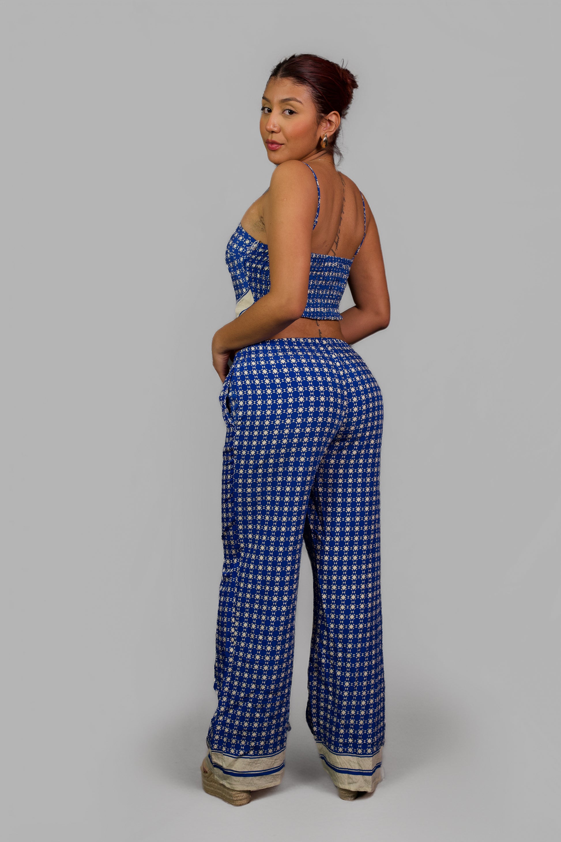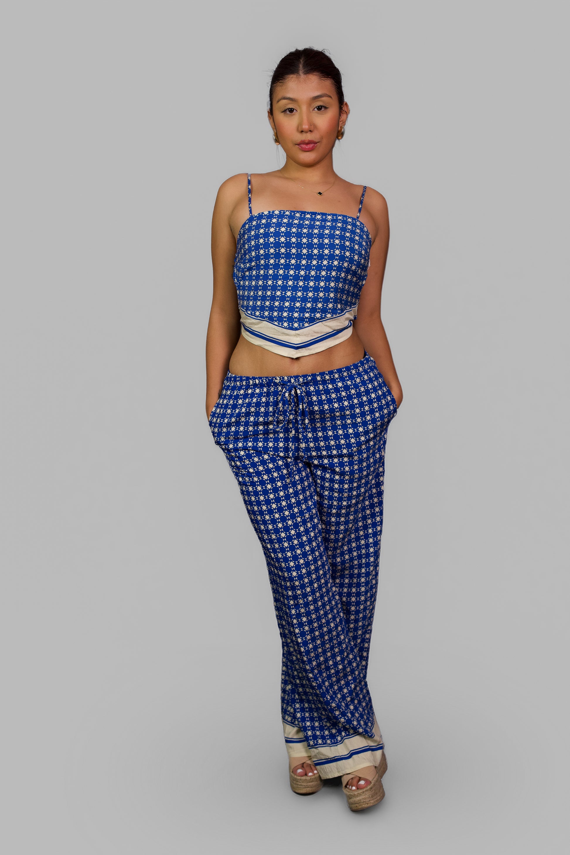 Destaca conestilo y frescura con esteconjunto de topy pantalón enazul vibrante conestampado geométrico en blanco. El top de tirantes y escote recto realza la figuray aporta un airemoderno, mientrasque el pantalón de pierna ancha y pretina elástica garantizacomodidad y libertadde movimiento. Los detallesen el borde inferiordel top y delpantalón añaden untoque artesanaly exclusivo, haciendode este set laelección perfectapara días soleados, escapadas oeventos casuales donde quieraslucir auténtica y cómoda.