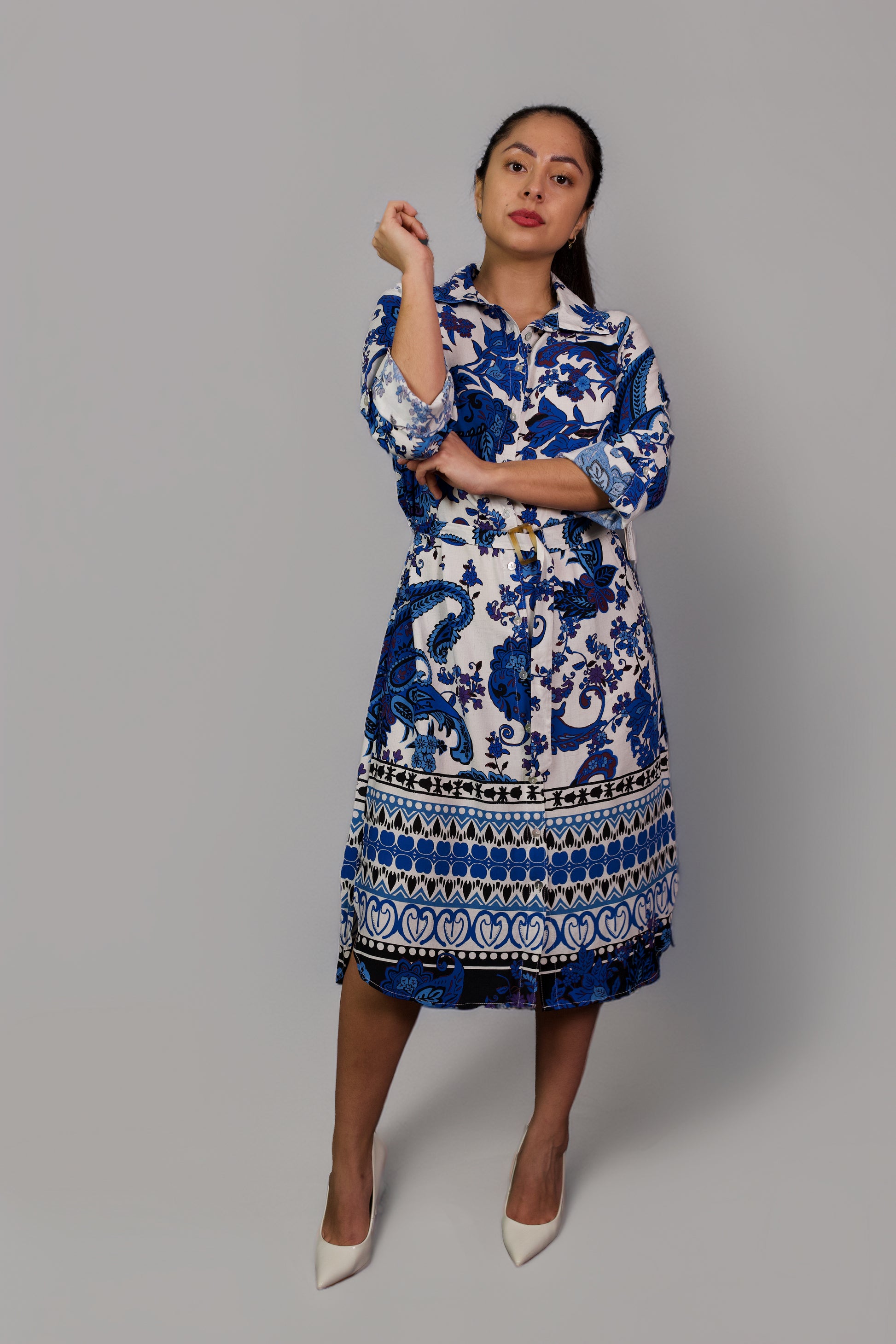 Renueva tu estilo con este vestido midi camisero en azul y blanco, una prenda que fusiona elegancia y frescura en un solo diseño. El estampado artístico en tonos azules aporta un aire sofisticado y moderno, mientras que la silueta fluida y el cinturón ajustable realzan la figura de manera favorecedora. Las mangas largas y el cuello clásico lo convierten en una opción versátil para el día a día, eventos especiales o reuniones de trabajo. Un vestido pensado para destacar con comodidad y distinción en cualquier ocasión.