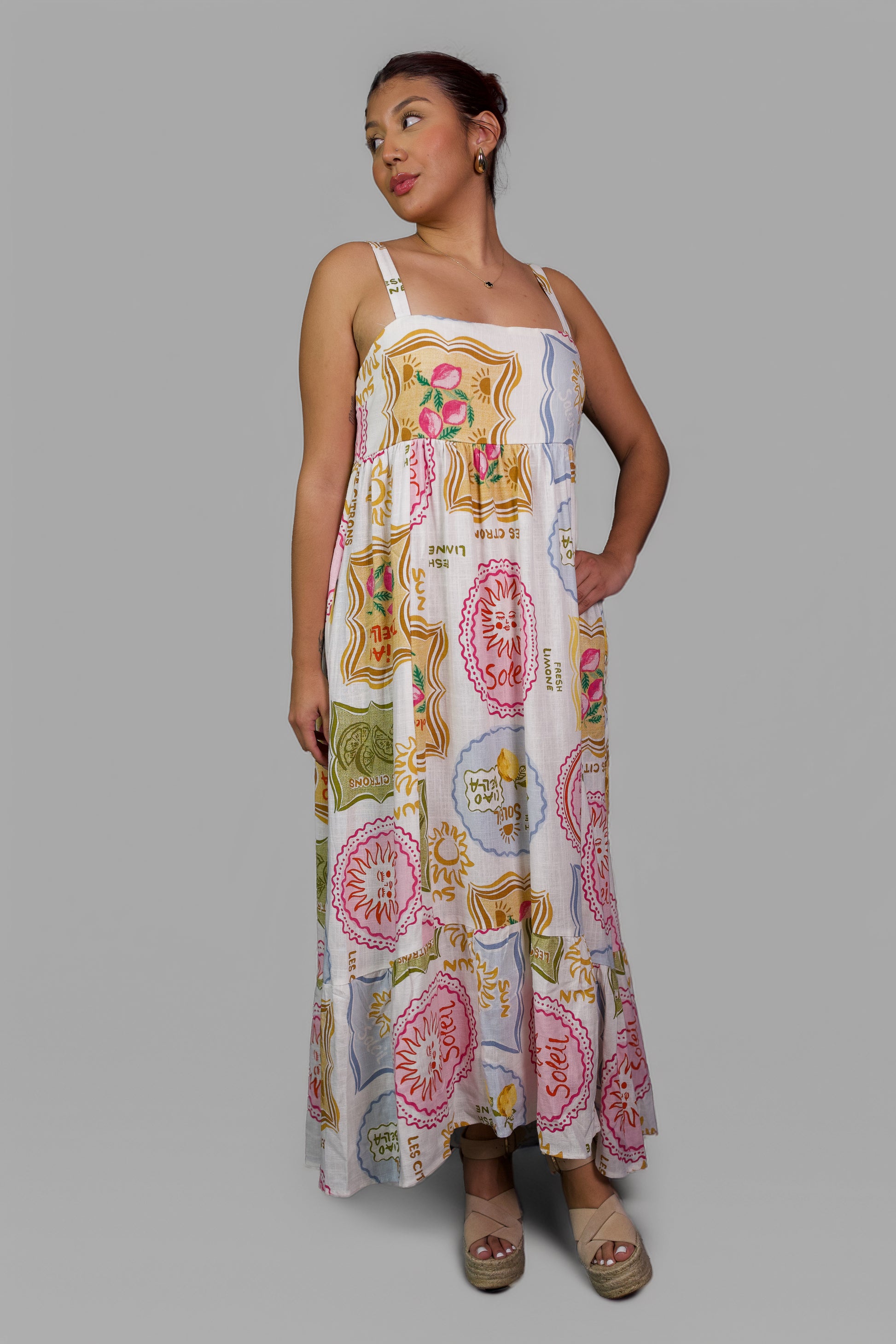 Luce fresca y auténtica con este vestido largo de tirantes, confeccionado en un tejido blanco con estampado artístico en tonos rosa, verde y mostaza. Su silueta amplia y ligera ofrece máxima comodidad y libertad de movimiento, mientras que los tirantes ajustables y el escote cuadrado realzan la figura con un toque femenino y moderno. Perfecto para días soleados, paseos al aire libre o eventos casuales donde quieras destacar con estilo y naturalidad.