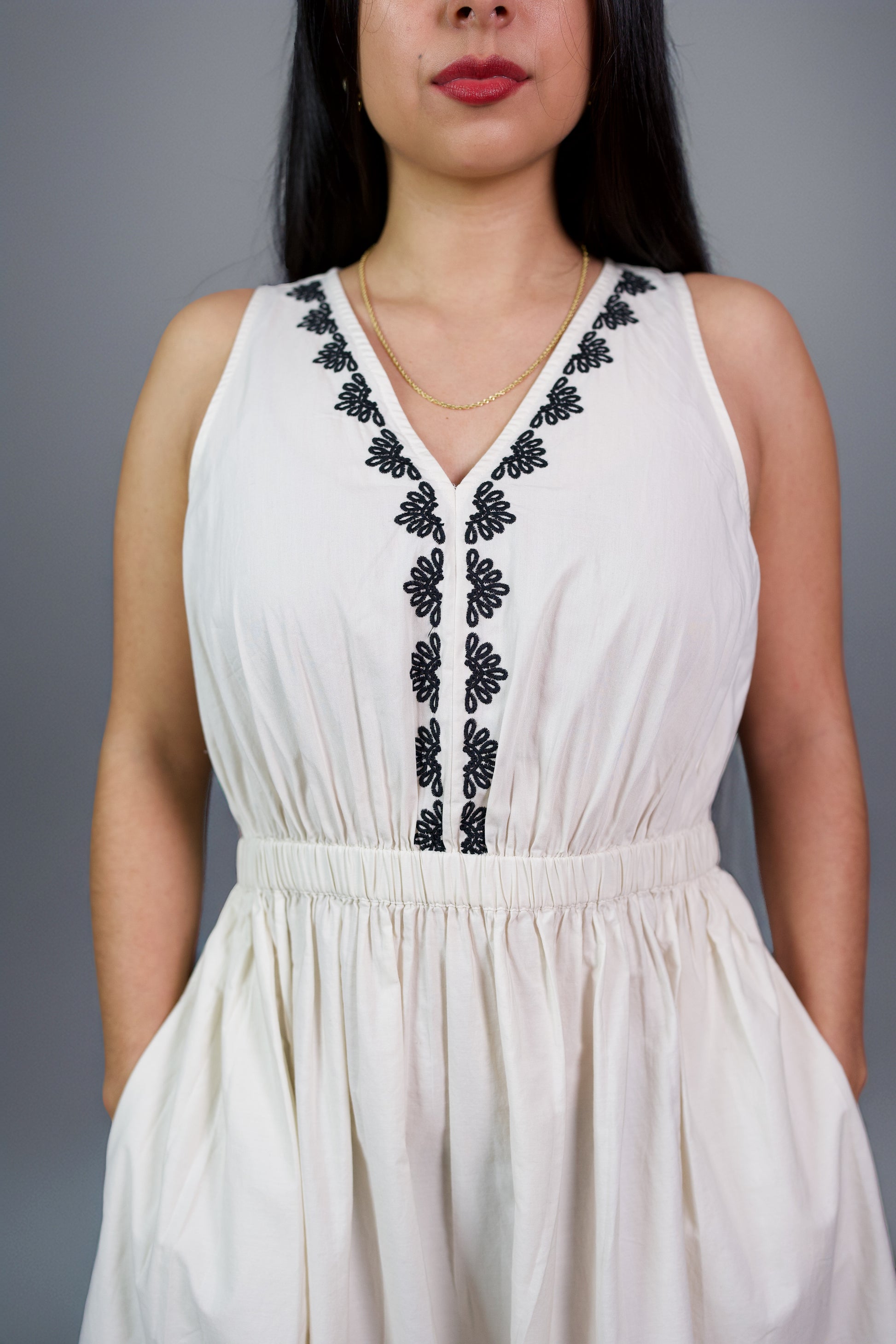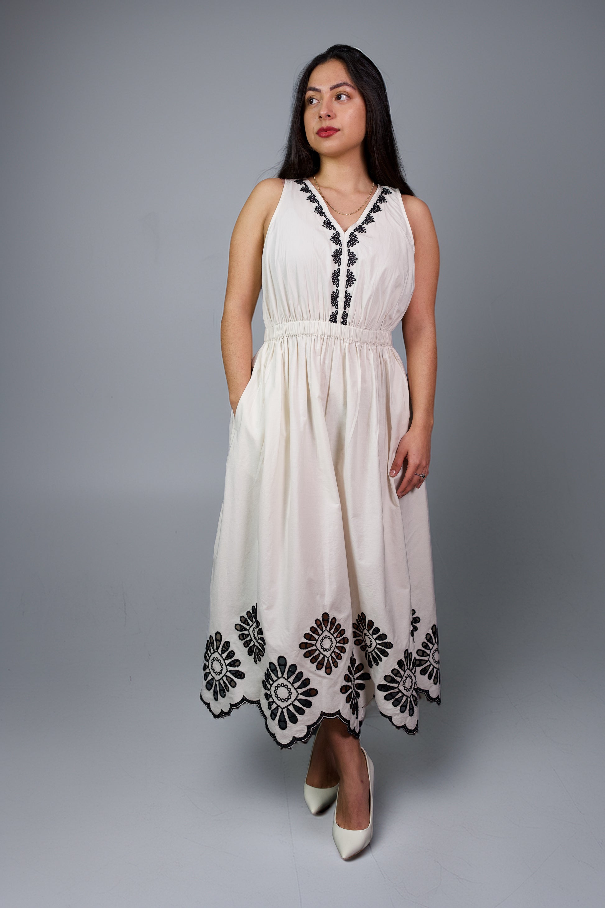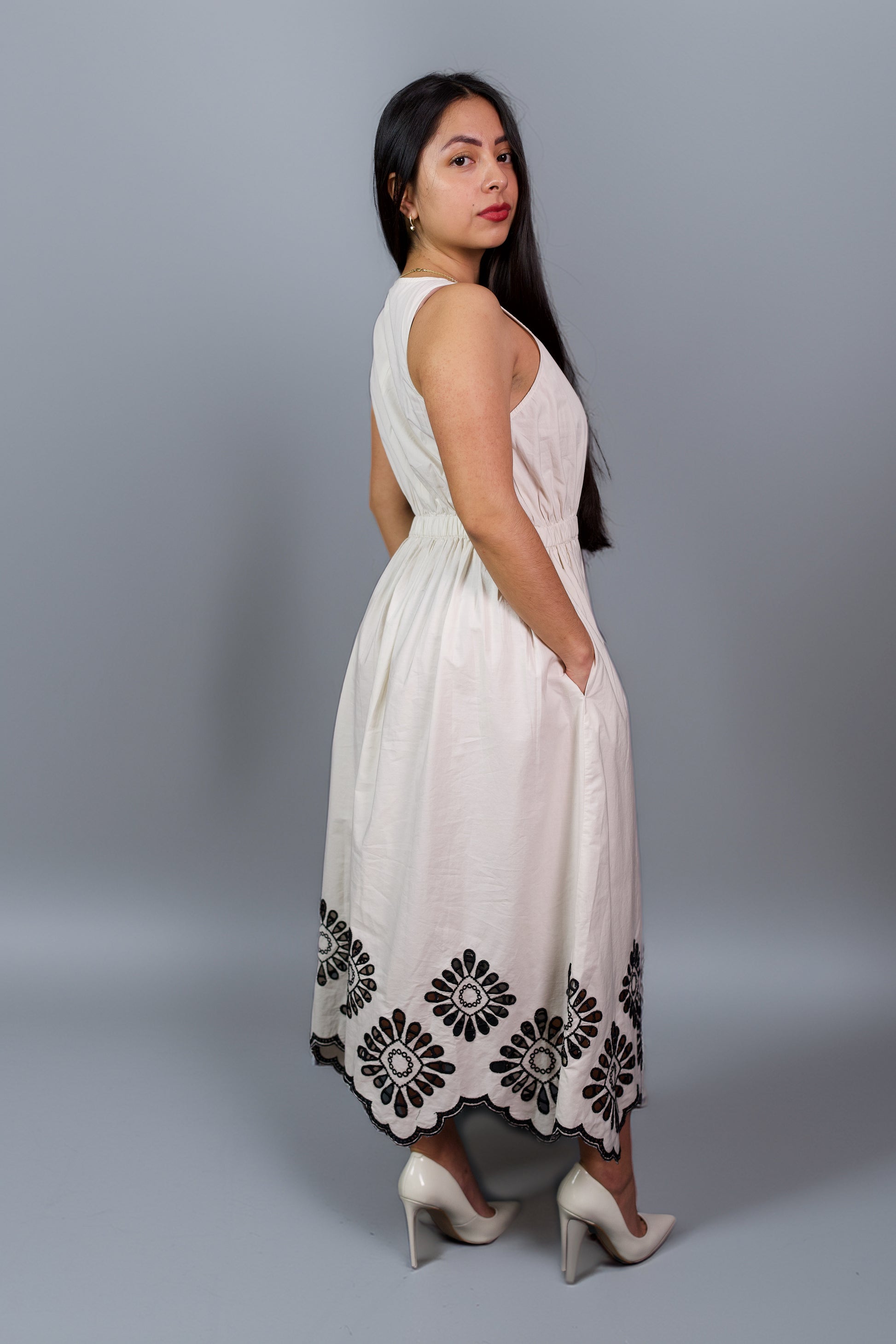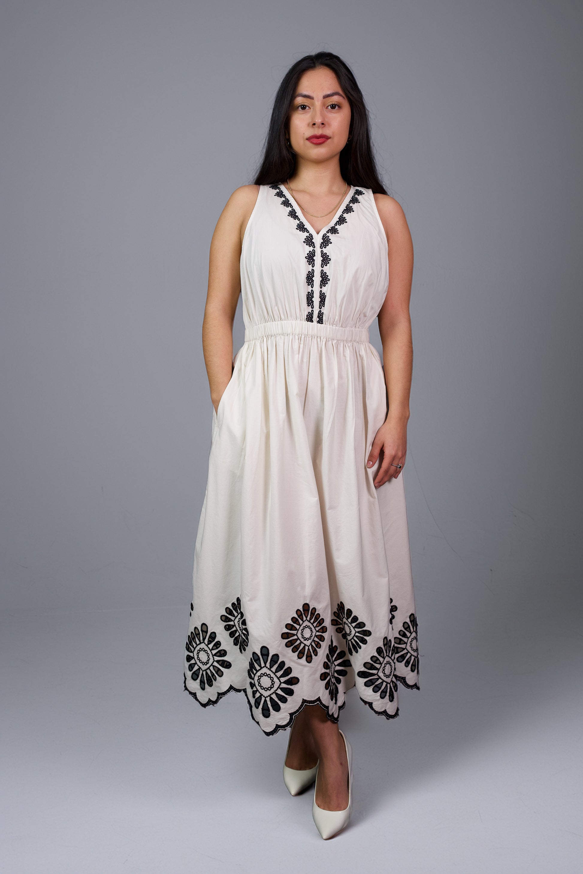 Descubre la elegancia bohemia de este vestido midi en color blanco con delicados bordados negros. Su diseño sin mangas y escote en V realza la silueta de forma natural, mientras que la cintura ligeramente fruncida y la falda amplia aportan frescura y libertad de movimiento. Los bordados artesanales en el escote y el ruedo añaden un toque sofisticado y artesanal, convirtiendo este vestido en una pieza versátil perfecta para días soleados, eventos informales o escapadas de fin de semana. Además, cuenta con prácticos bolsillos laterales para mayor comodidad.